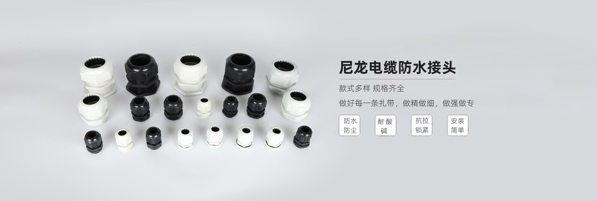 尼龍材質(zhì)適用惡劣環(huán)境 紅、灰、黑、深灰、白、藍 六種顏色 常規(guī):黑、灰兩種顏色,其它顏色需要定做 在嚴寒與高溫等惡劣環(huán)境下,保持長期不開裂不漏水 高密封性防水接頭保護電纜安全,長期使用不容易滲水